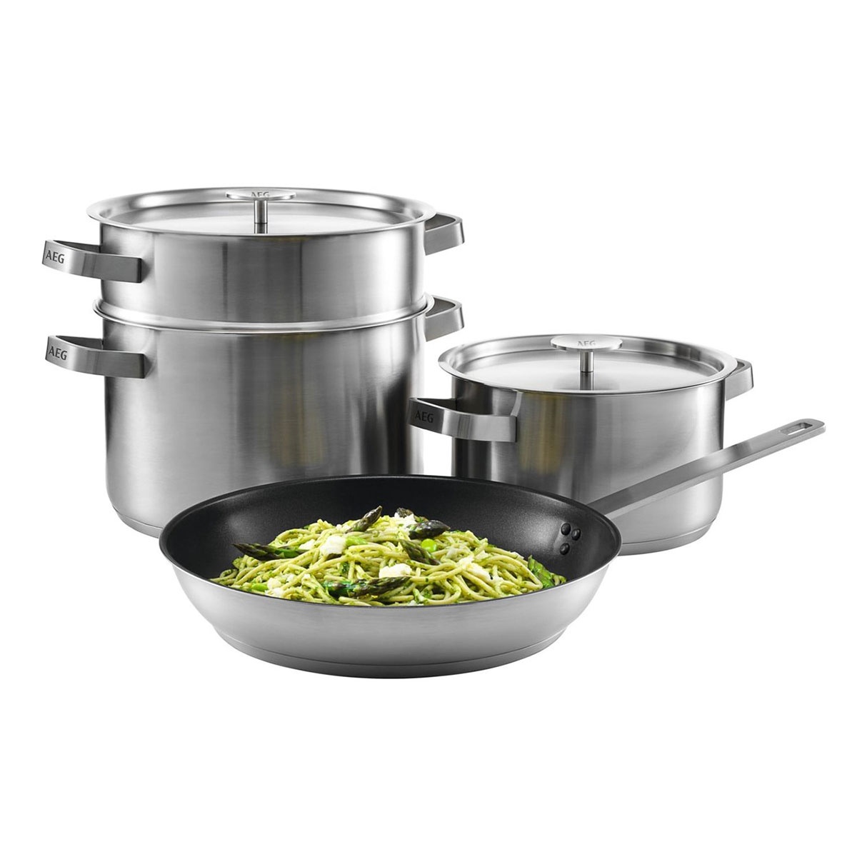 De AEG CulinaryMaster™ A4SS is een luxe 4-delige RVS pannenset. Hij is geschikt voor alle warmtebronnen (incl. inductie) en bevat een unieke pastazeef voor moeiteloos koken en afgieten.