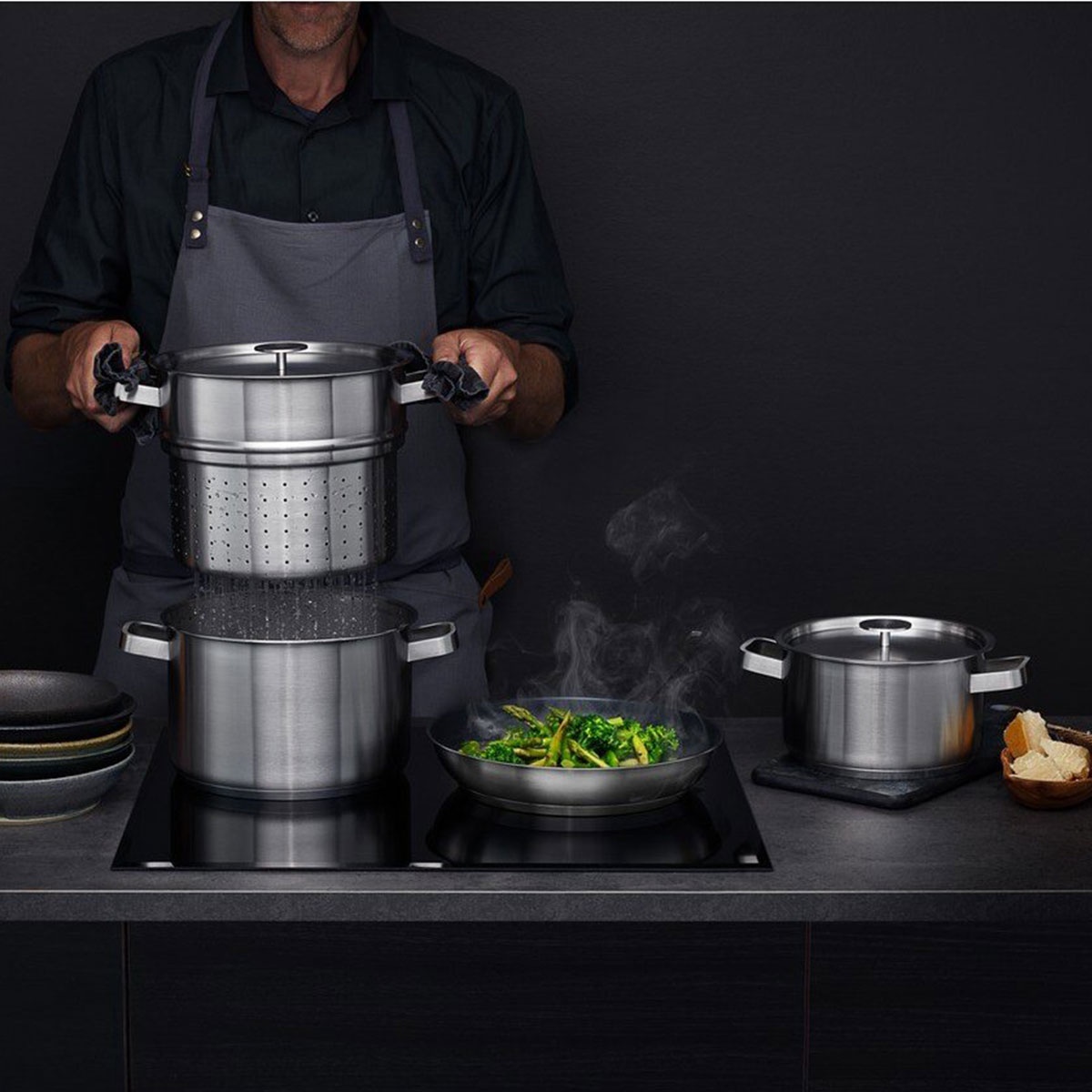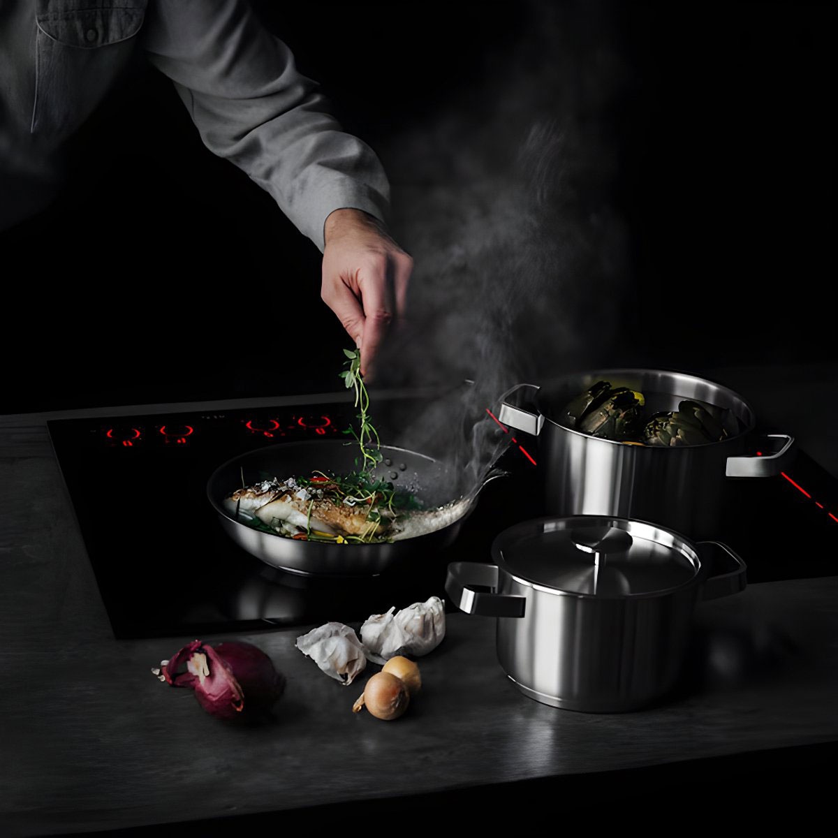 - Professionele Warmteverdeling: De 3-laagse RVS 18/10 constructie garandeert snelle en gelijkmatige verwarming.