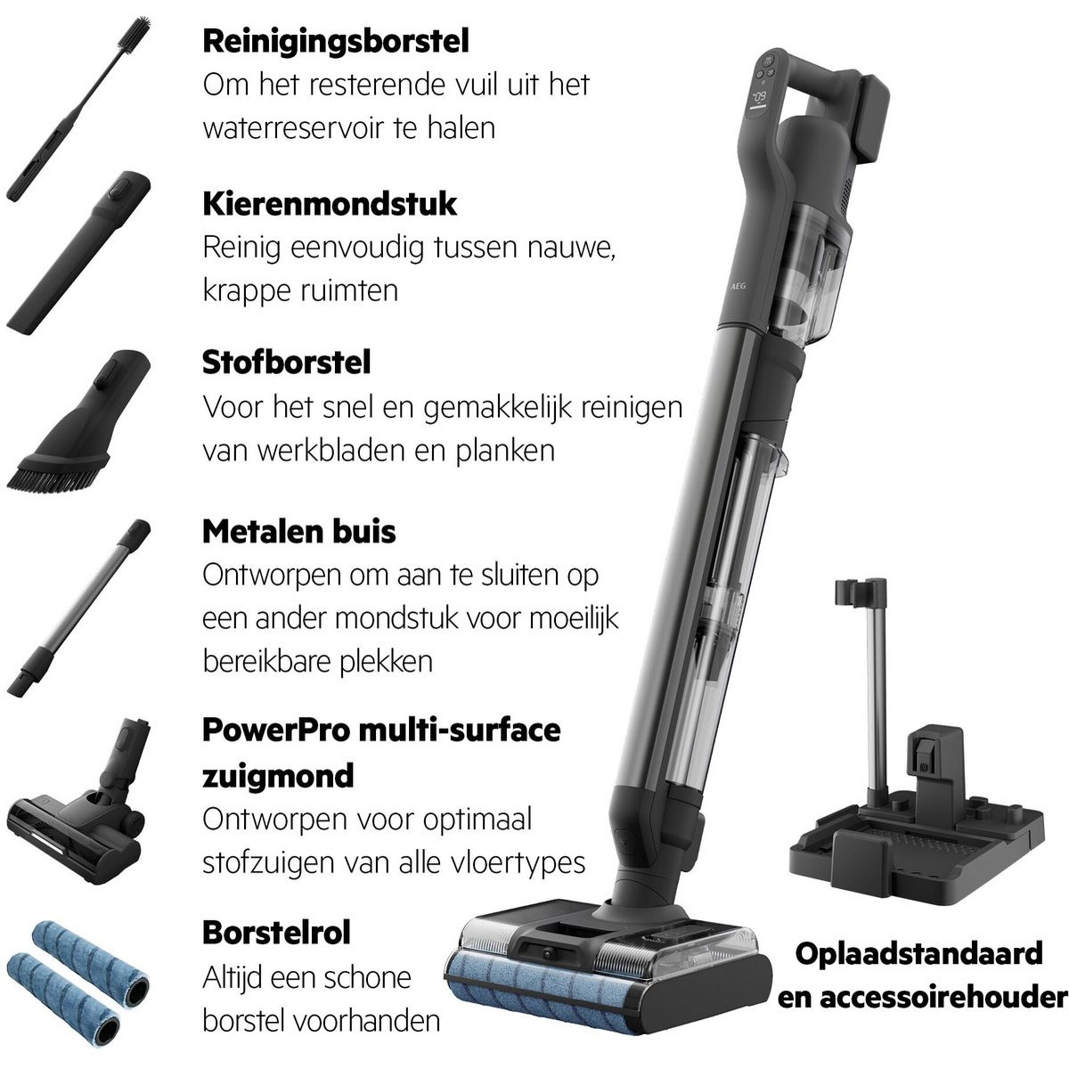 | Verpakkingsinhoud | 1x Handleiding 1x AEG Ultimate 8000 Basiseenheid 1x TriAction nat-reinigingsmondstuk 1x Multi-surface droog-zuigmond 1x Oplaad- en reinigingsstation |