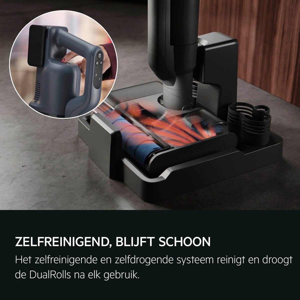 Gedoe met het handmatig schoonmaken van dweilborstels behoort tot het verleden. Zodra de stofzuiger op het oplaadstation staat, activeert u het zelfreinigende systeem. De DualRolls worden met een snelheid van 700 tpm gespoeld en vervolgens gedroogd bij maximaal 70°C. Dit proces verwijdert vuil en geurtjes effectief, waardoor de rollen altijd fris en klaar voor de volgende klus zijn.