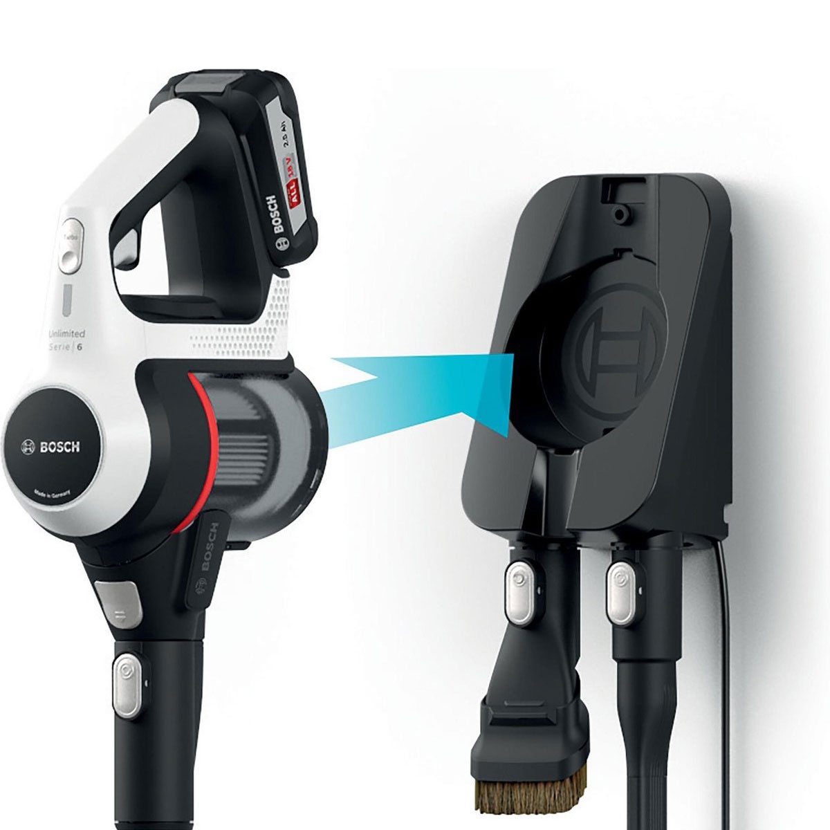 Onder het slanke design schuilt een krachtige en duurzame motor, ontwikkeld met de betrouwbare Duitse Bosch-motortechnologie. In combinatie met de speciaal ontworpen borstel levert dit een grondig reinigingsresultaat op alle vloertypen. Klaar met schoonmaken? De Bosch Unlimited 6 verdwijnt niet in een kast. U hangt hem eenvoudig op aan de wandhouder met oplaadfunctie. Zo bergt u hem niet alleen stijlvol op, maar wordt hij ook direct opgeladen. Kortom, hij is altijd opgeruimd en altijd klaar voor de volgende klus.