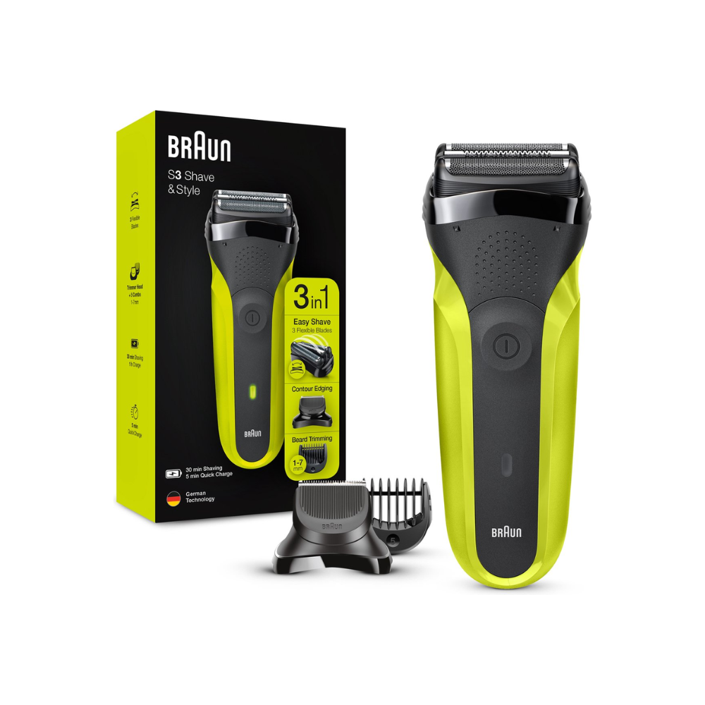 Het Braun Series 3 Shave & Style oplaadbare elektrische scheersysteem is het ideale 3-in-1 verzorgingsapparaat. Kies tussen een gladde scheerbeurt en nauwkeurig baardtrimmen en -stylen door eenvoudigweg de kop van het apparaat te verwisselen en een van de 5 kamopzetstukken te gebruiken om de gewenste baardlengte te bereiken. Doos bevat: 1 x Elektrisch scheerapparaat, 1 x Trimmeropzetstuk, 5 kammen: 1, 2, 3, 5, 7 mm1 x beschermkap1 x SmartPlug.