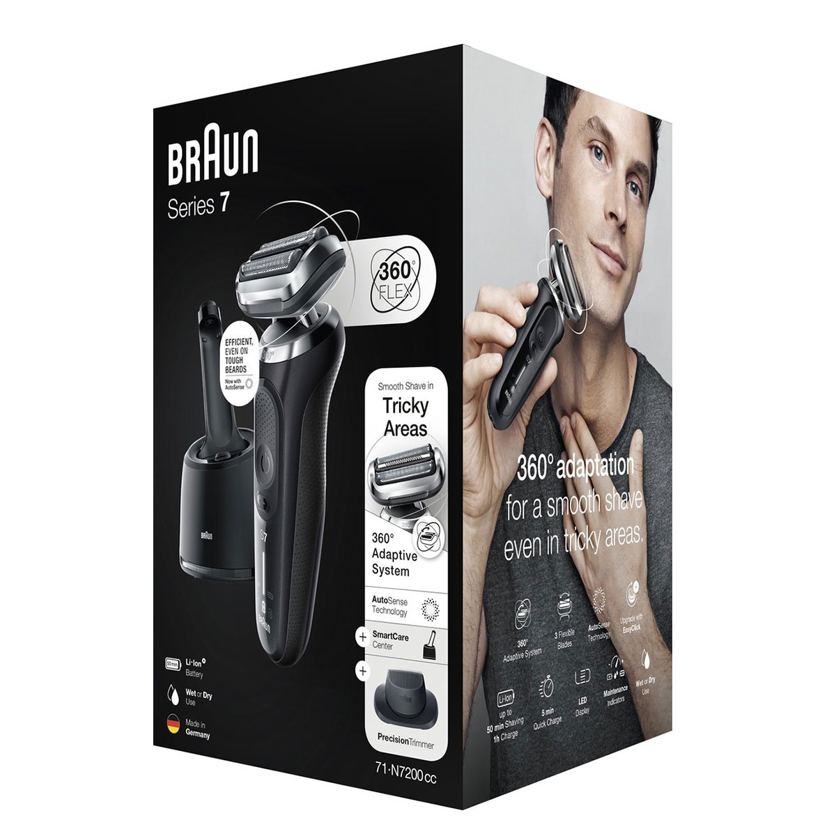 De Braun Series 7 71-N7200cc biedt een superieur gladde scheerbeurt met zijn 360° Flex-kop en AutoSense-technologie. Deze complete set bevat het SmartCare Center voor een dagelijks nieuw apparaat.