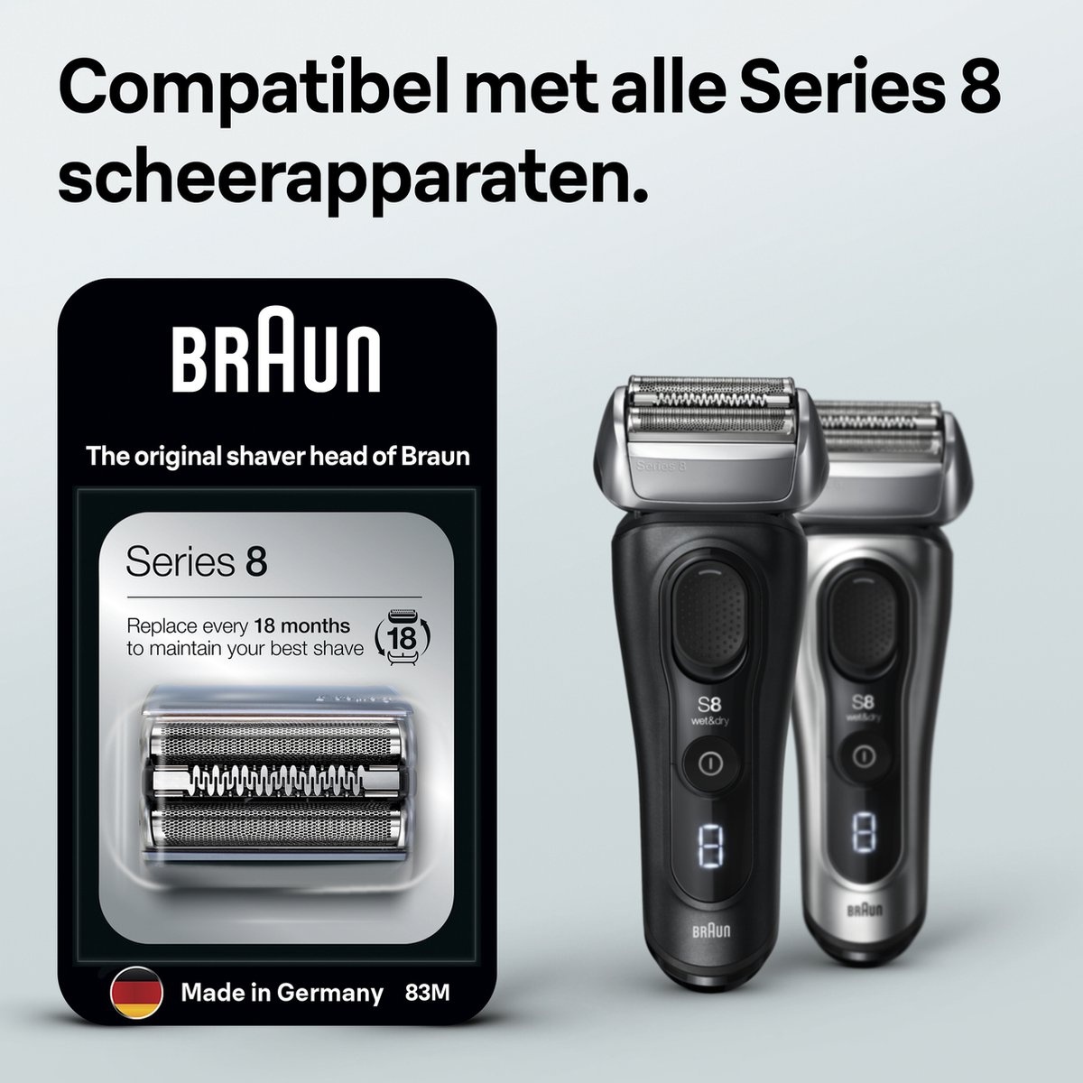 Braun raadt aan om uw scheerkop **elke 18 maanden** te vervangen. Dit is de sleutel tot een langdurig comfortabele en nauwkeurige scheerbeurt. Door de kop op tijd te vervangen, voorkomt u dat de mesjes bot worden en irritatie veroorzaken. Het verwisselen is bovendien kinderlijk eenvoudig. Met slechts één simpele klik maakt u de oude kop los en klikt u de nieuwe 83M vast. Zo is uw Series 8 in een oogwenk weer in absolute topconditie, klaar voor de volgende 18 maanden perfectie. Zorg voor uw scheerapparaat, en het zal voor u zorgen.