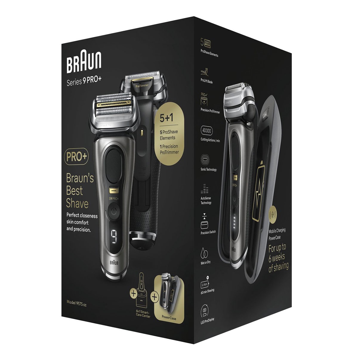 De Braun Series 9 Pro+ 9575cc is Braun's beste scheerapparaat, voor ultieme gladheid en huidcomfort. Deze complete set bevat het 6-in-1 SmartCare Center voor een dagelijks nieuw apparaat en de unieke PowerCase voor 90 min. scheren.