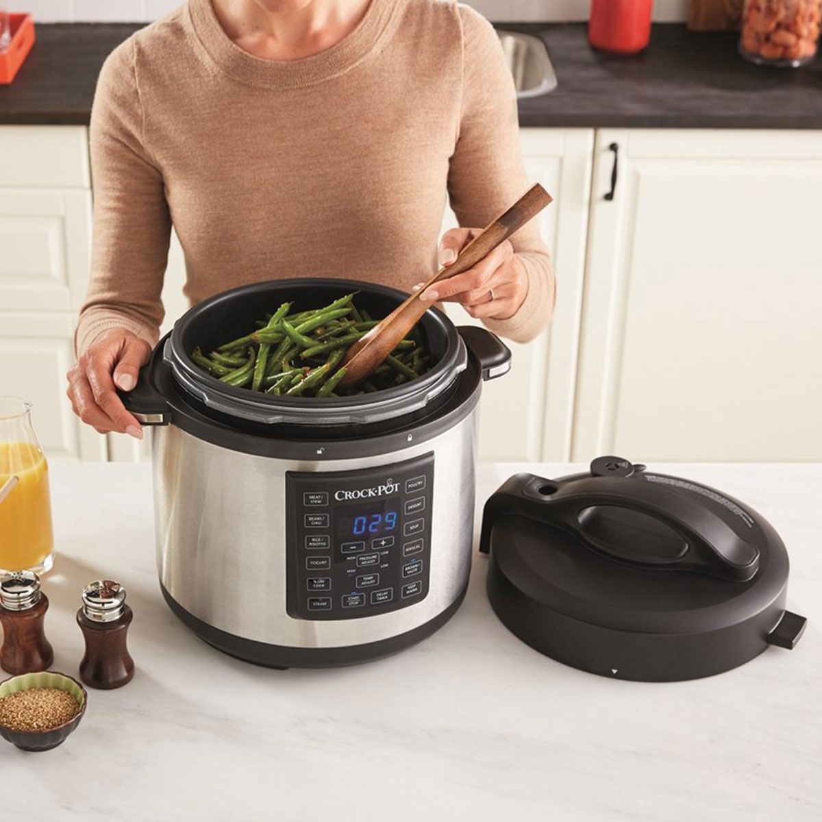 De CrockPot Express-Pot CR051 brengt een revolutie naar uw keuken. Dankzij de geavanceerde snelkooktechnologie bereidt u gerechten die normaal uren moeten sudderen in een fractie van de tijd. Spareribs vallen na 20 minuten van het bot en een volledige risotto staat binnen 8 minuten op tafel. Wilt u toch liever traditioneel langzaam garen? Schakel dan moeiteloos over naar de vertrouwde slowcook-functie.