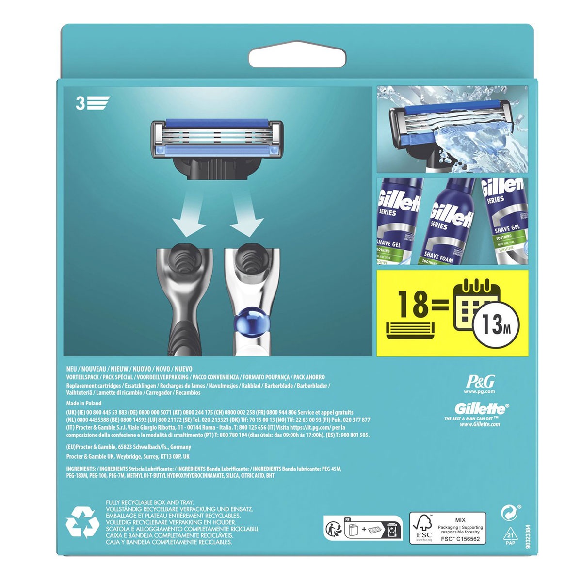 De Gillette Mach3 navulmesjes (18 stuks) zijn ontworpen voor een klassieke, gladde scheerbeurt. Elk mesje is goed voor 15 comfortabele scheerbeurten en heeft een verbeterde, beschermende Lubrastri