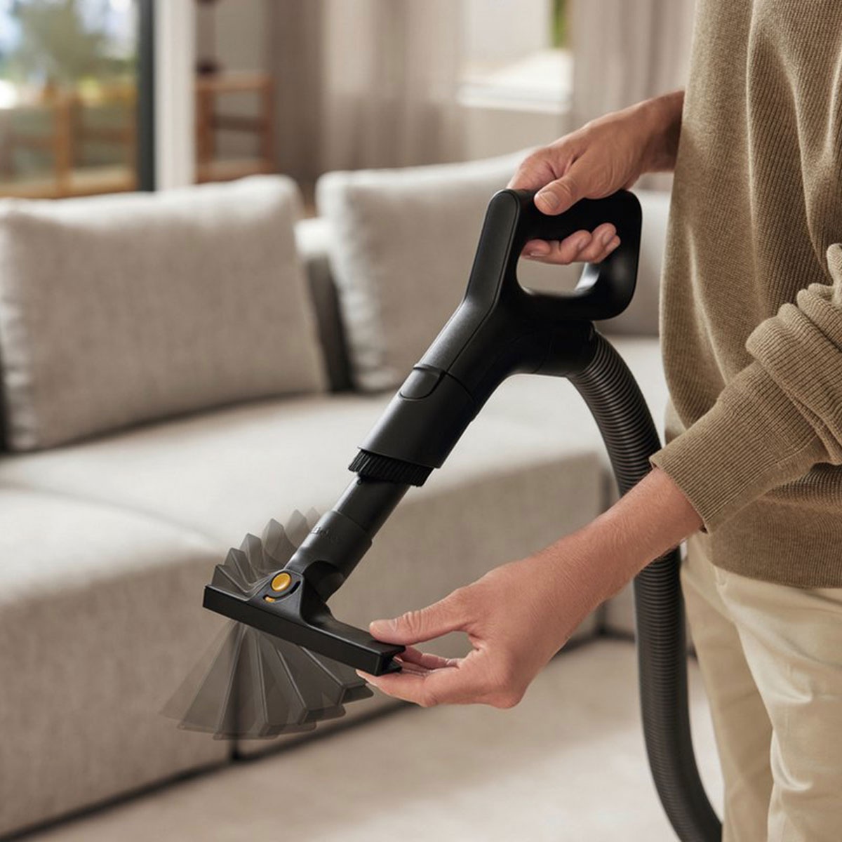 De Guard L1 AllFloor wordt geleverd met een uitgebreide set hulpstukken voor elke klus. De AllFloor zuigmond is extra plat en wendbaar, ideaal voor zowel harde vloeren als tapijt. In de achterkant van de stofzuiger vindt u het TwoInOne mondstuk (meubelzuigmond en kierenzuiger) en aan de handgreep bevindt zich een geïntegreerde reliëfborstel voor het behoedzaam afstoffen van fotolijsten en kwetsbare voorwerpen.