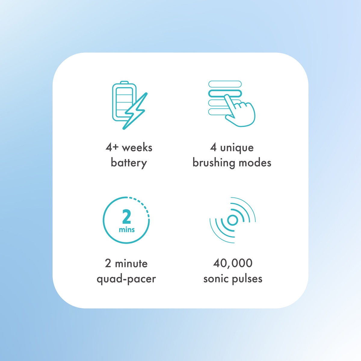 - Ingebouwde Poetscoach: De 2-minuten timer met 30-seconden quad-pacer helpt u poetsen zoals tandartsen aanbevelen.