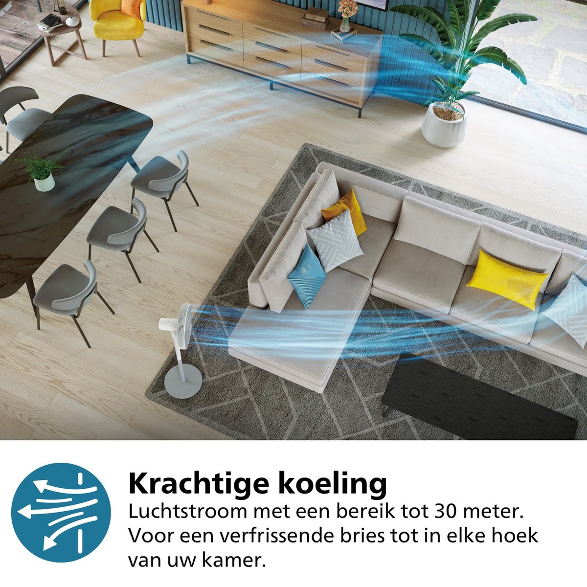 - Indrukwekkend Bereik: Luchtstroom voelbaar tot wel 30 meter ver.