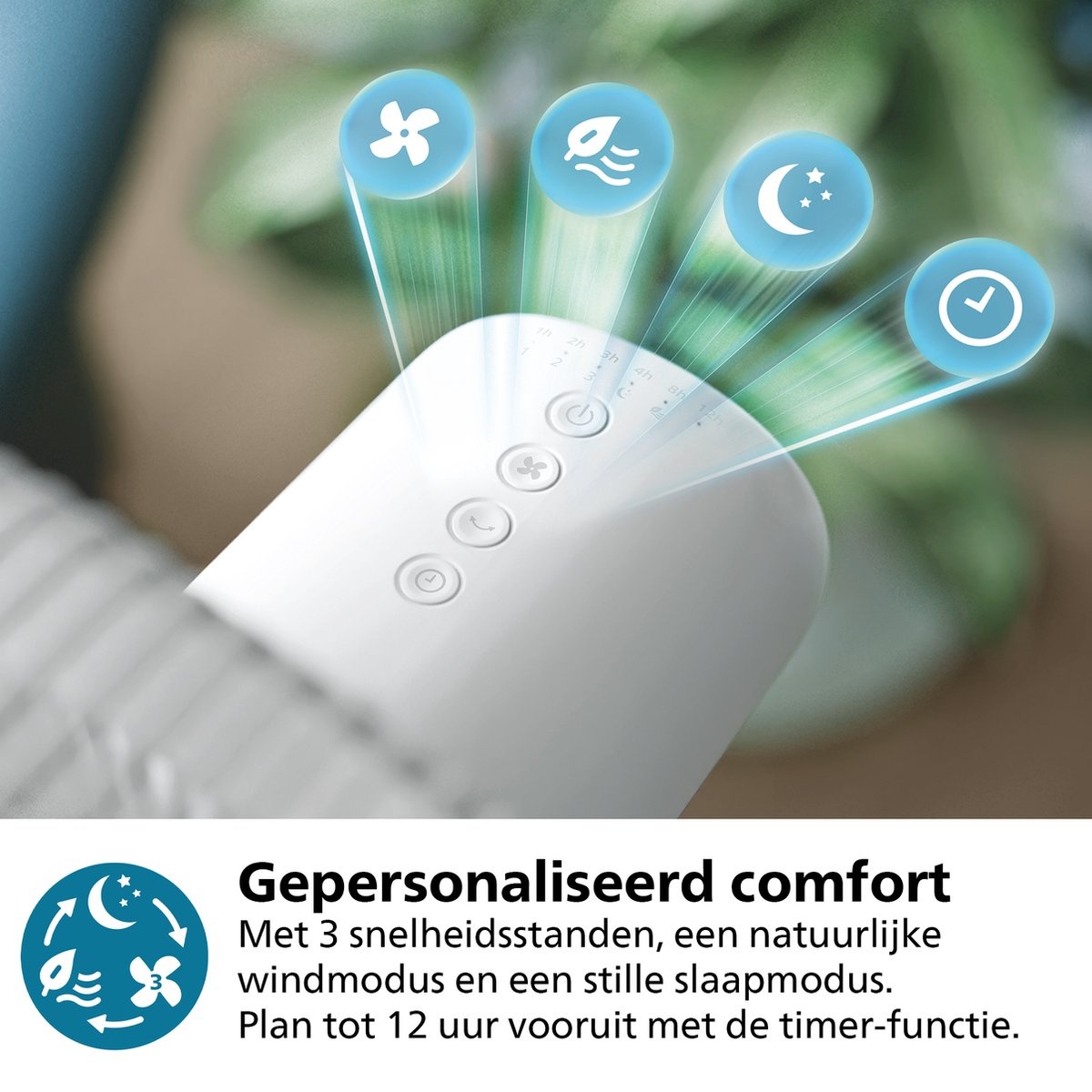 Kies uit drie snelheidsinstellingen en twee slimme modi voor de ultieme beleving. De Natuurlijke Briesstand bootst de variatie van een buitenbriesje na, terwijl de Stille Slaapstand de snelheid geleidelijk verlaagt voor een natuurlijke overgang naar de slaap. Met de uitgebreide timerfunctie plant u de koeling tot 12 uur vooruit, wat bijdraagt aan extra gebruiksgemak en energiebesparing.