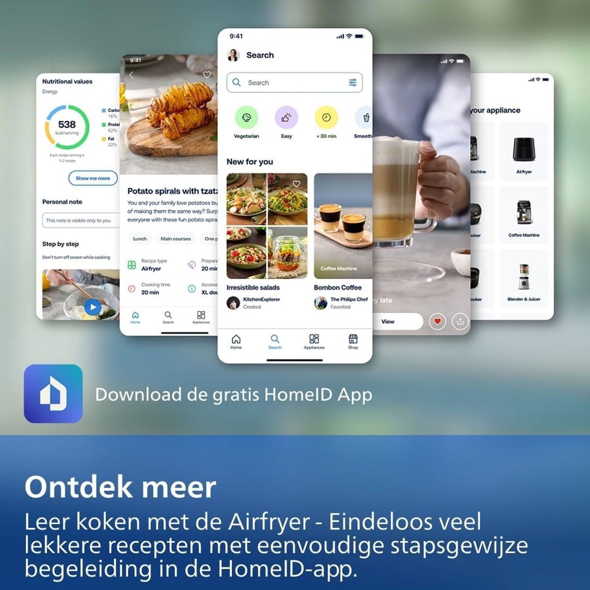 Haal het maximale uit uw Airfryer met de Philips HomeID-app. Hier vindt u honderden heerlijke recepten en tips die specifiek zijn afgestemd op uw apparaat, zodat u elke dag weer kunt variëren met gezonde maaltijden.