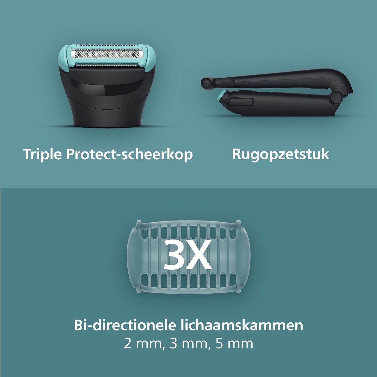 Veelzijdige bodygroomer voor het hele lichaam met een speciaal opzetstuk voor de rug. Voorzien van huidcomfort-systeem, 3 trimkammen en volledig waterdicht voor gebruik onder de douche.