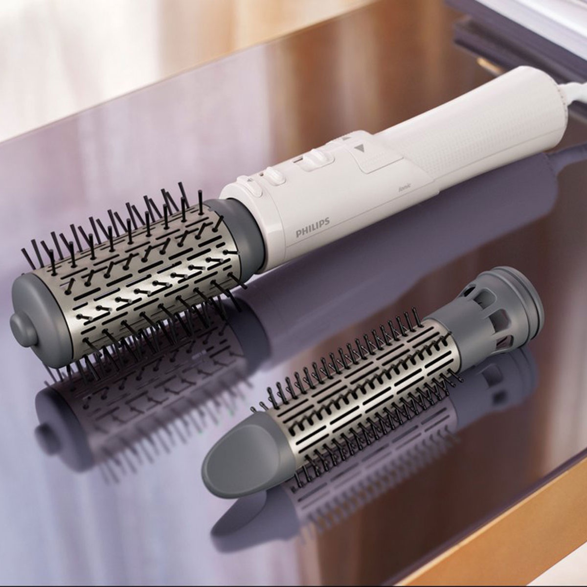 - Intrekbare borstel (30 mm): Speciaal ontworpen om gedefinieerde golven te creëren zonder dat de haren vast komen te zitten in de borstel.