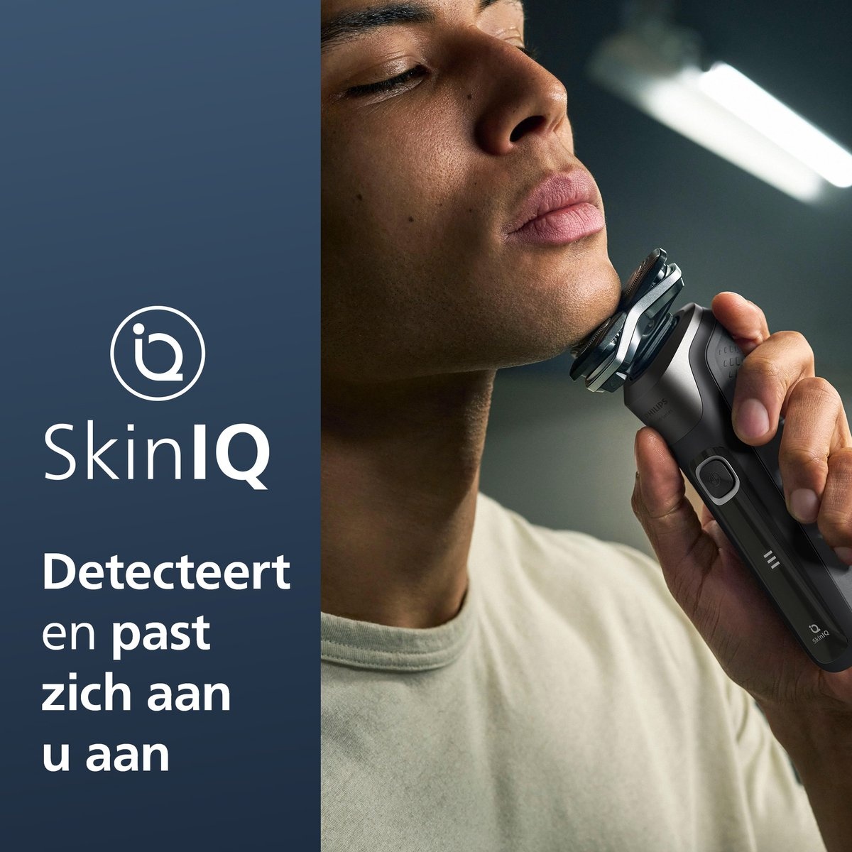 Krachtig elektrisch scheerapparaat met SkinIQ-technologie die zich aanpast aan uw baarddichtheid. Voorzien van 45 zelfslijpende SteelPrecision-mesjes, volledig flexibele koppen en 60 minuten draadloze autonomie.