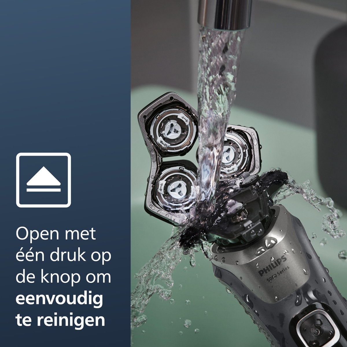 Kies de scheerroutine die bij u past. Met de Wet & Dry-technologie kunt u kiezen voor een snelle droge scheerbeurt of een verfrissende natte scheerbeurt met gel of schuim, zelfs onder de douche. Na gebruik reinigt u het apparaat hygiënisch door de scheerkop met één druk op de knop te openen en volledig onder de kraan af te spoelen.