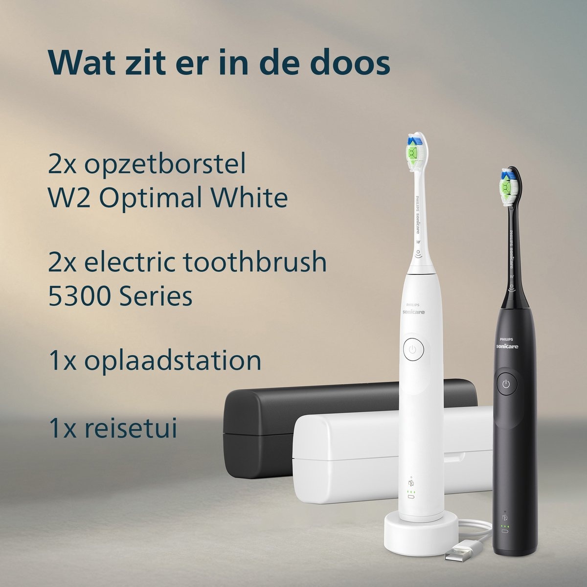 Luxe duopack met een zwart en een wit handvat uit de Philips Sonicare 5300 serie. Voorzien van sonische technologie, W2 Optimal White-opzetborstels en reisetuis voor een stralende glimlach, overal ter wereld.