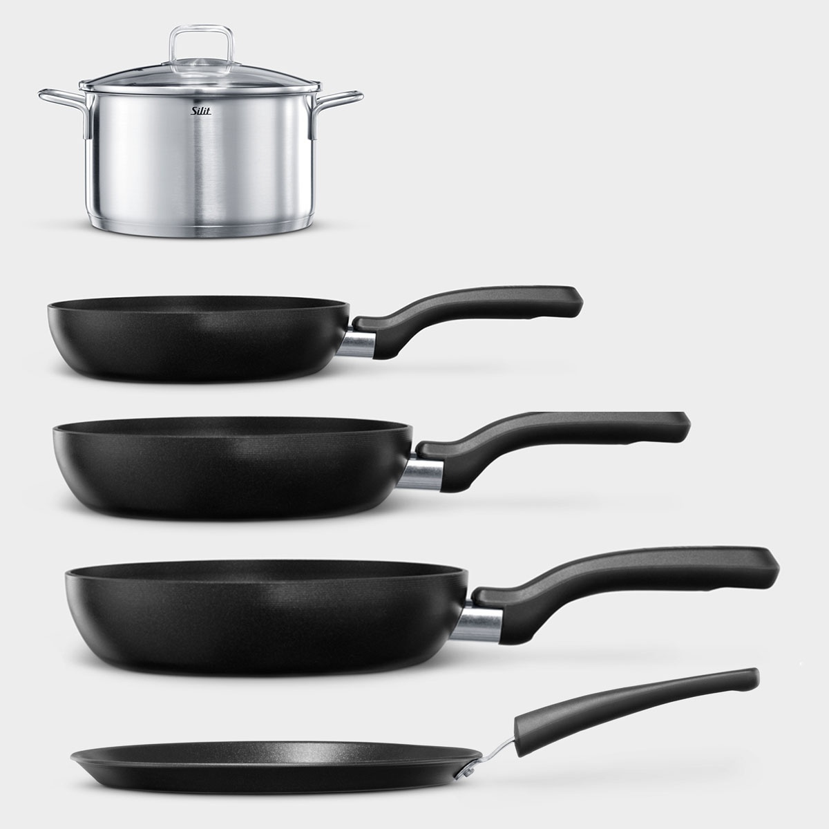 De Silit Master-set is de ultieme combinatie voor de gepassioneerde thuiskok. Deze 5-delige set bevat drie Collexio koekenpannen voor dagelijks bakwerk, een gespecialiseerde pannenkoekenpan voor het fijnere werk en de royale Style kookpan van 5,7 liter. Een complete set van topkwaliteit, volledig geoptimaliseerd voor inductie en alle andere warmtebronnen.