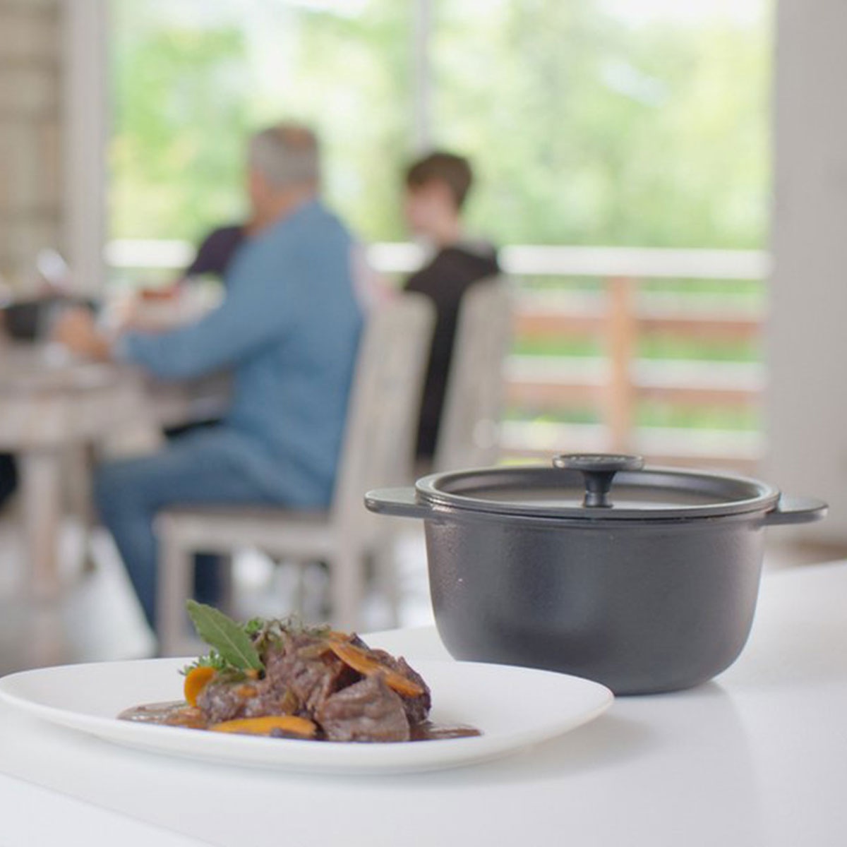 Het geheim van een perfecte stoofschotel zit in het deksel. De Tefal Tradition is uitgerust met speciale druipringen aan de binnenzijde. Condens verzamelt zich hier en valt gelijkmatig terug op het gerecht, waardoor uw vlees extra mals blijft. Voor een nog intenser proces beschikt het deksel over een hoge opstaande rand waar u ijsblokjes of koud water op kunt leggen. Dit temperatuurverschil zorgt voor een maximale condensatie binnenin de pan.