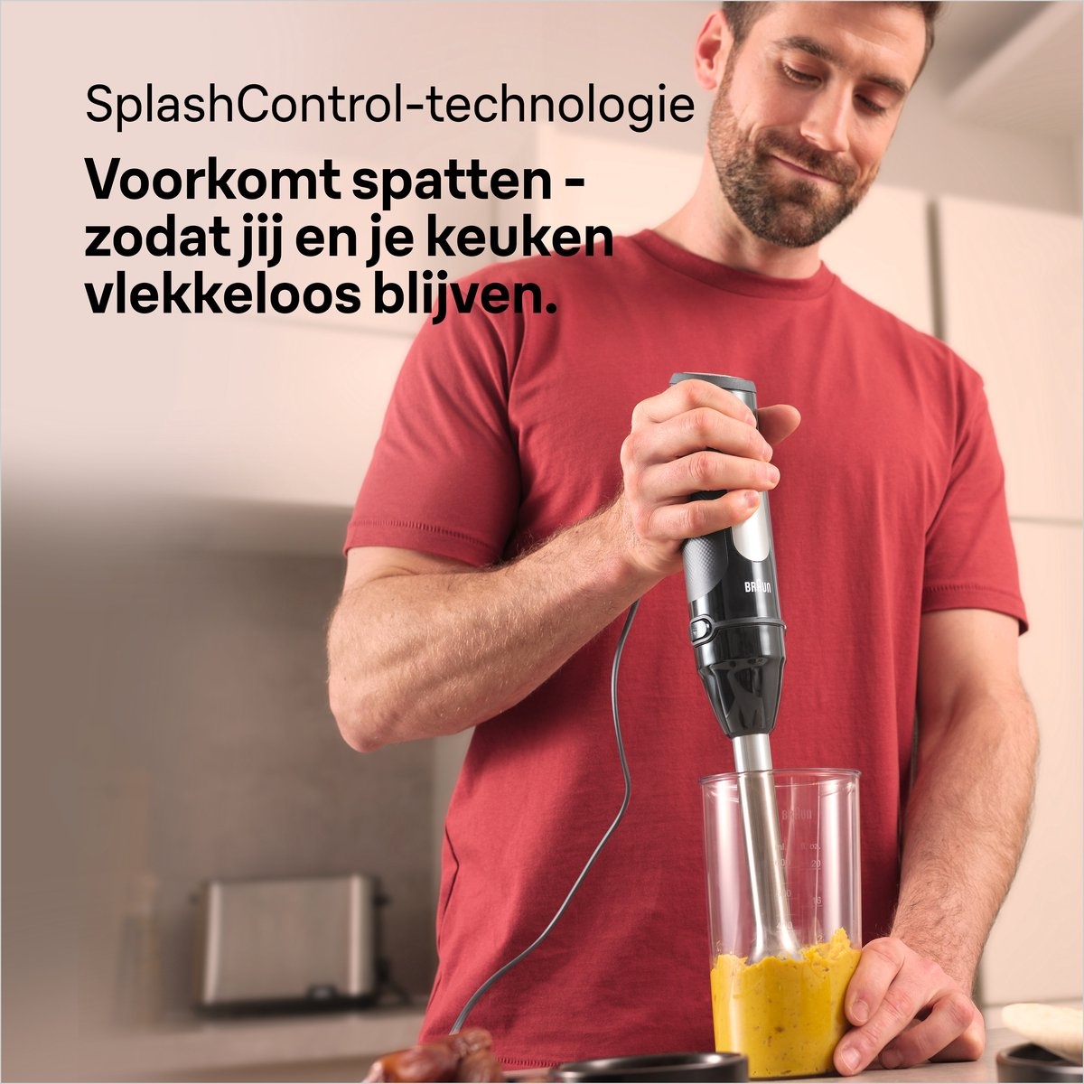 - SplashControl Technologie: De klokvormige staafmixervoet en antispatrand voorkomen morsen en spatten, zodat je keuken schoon blijft tijdens het gebruik.