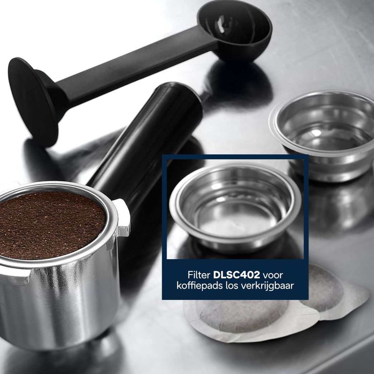 - Flexibel in Gebruik: Geschikt voor zowel versgemalen koffie (1- en 2-kops filters meegeleverd) als voor E.S.E. servings (apart verkrijgbare filter nodig) voor extra gemak.