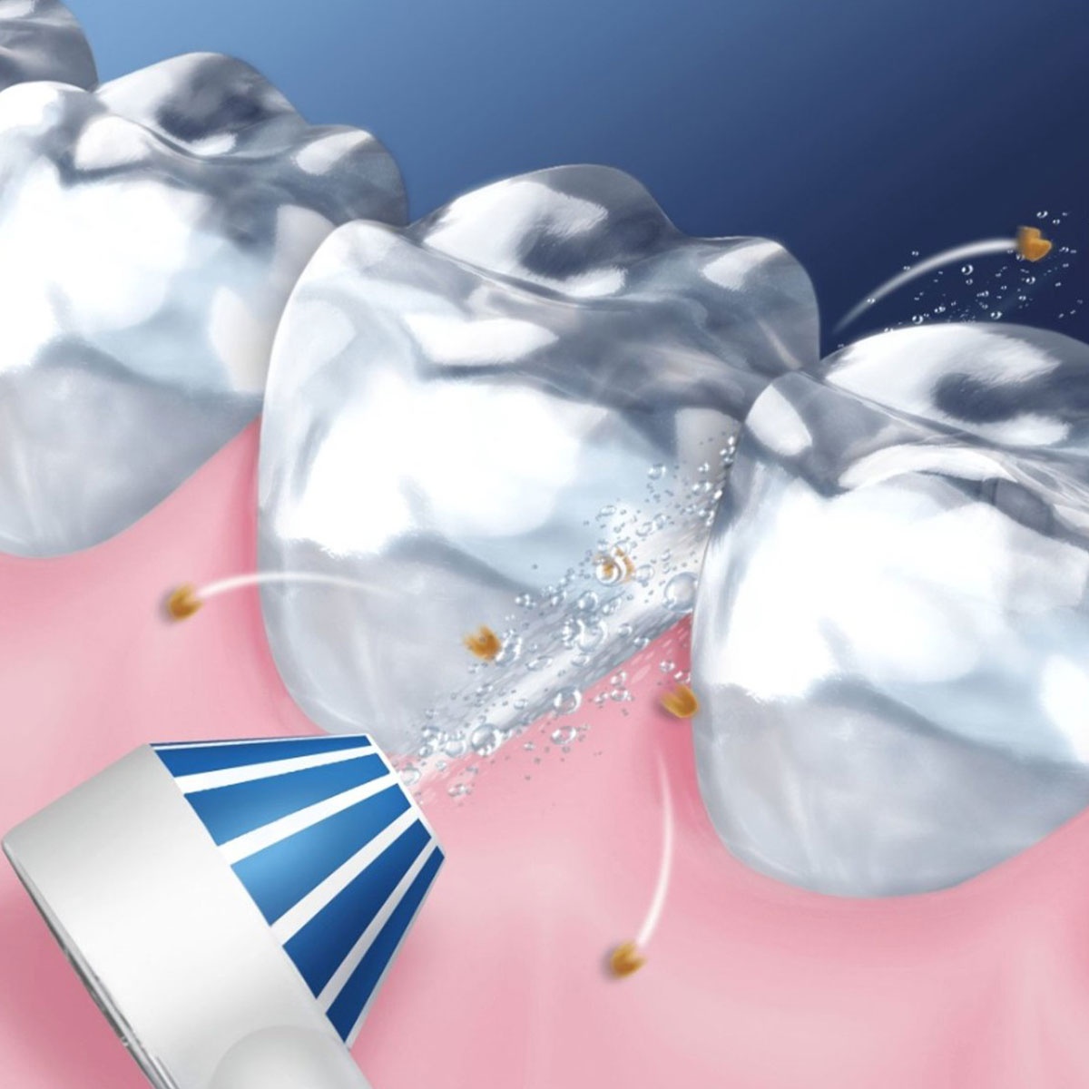 De ware innovatie schuilt in de unieke Oxyjet-technologie. Deze technologie verrijkt het water met gezuiverde lucht in de vorm van microbelletjes. Voel hoe deze zachte, pulserende waterstraal niet alleen etensresten en tandplak wegspoelt, maar tegelijkertijd uw tandvlees masseert en verzorgt. Het is de ideale, zachte reiniging, zelfs voor mensen met gevoelig tandvlees, beugels of implantaten. Met de 'on-demand' knop heeft u bovendien volledige controle en activeert u de waterstraal alleen wanneer u dat wilt.