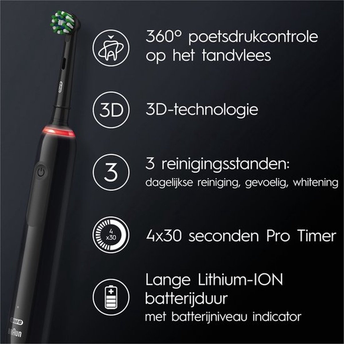 De Pro 3 3500 is uitgerust met de befaamde 3D-technologie van Oral-B, die roteert en pulseert om tot 100% meer tandplak te verwijderen dan een handtandenborstel. De ingebouwde 360° poetsdruksensor beschermt uw tandvlees actief door u direct te waarschuwen met een rood lichtsignaal als u te hard poetst. Met een lange accuduur en een handige reisetui is dit de ideale tandenborstel voor zowel thuis als onderweg.