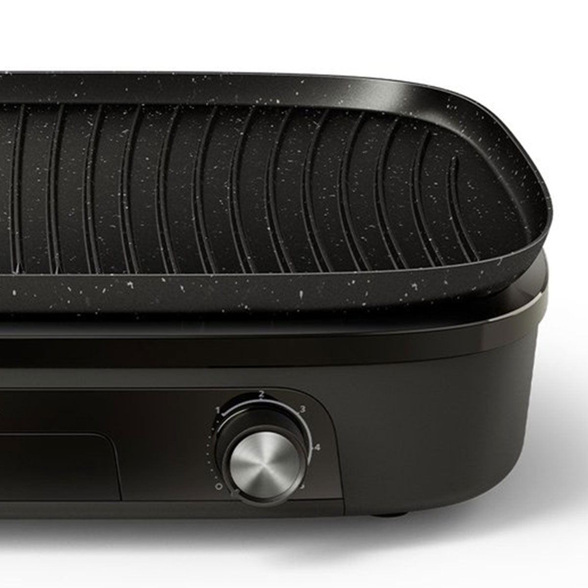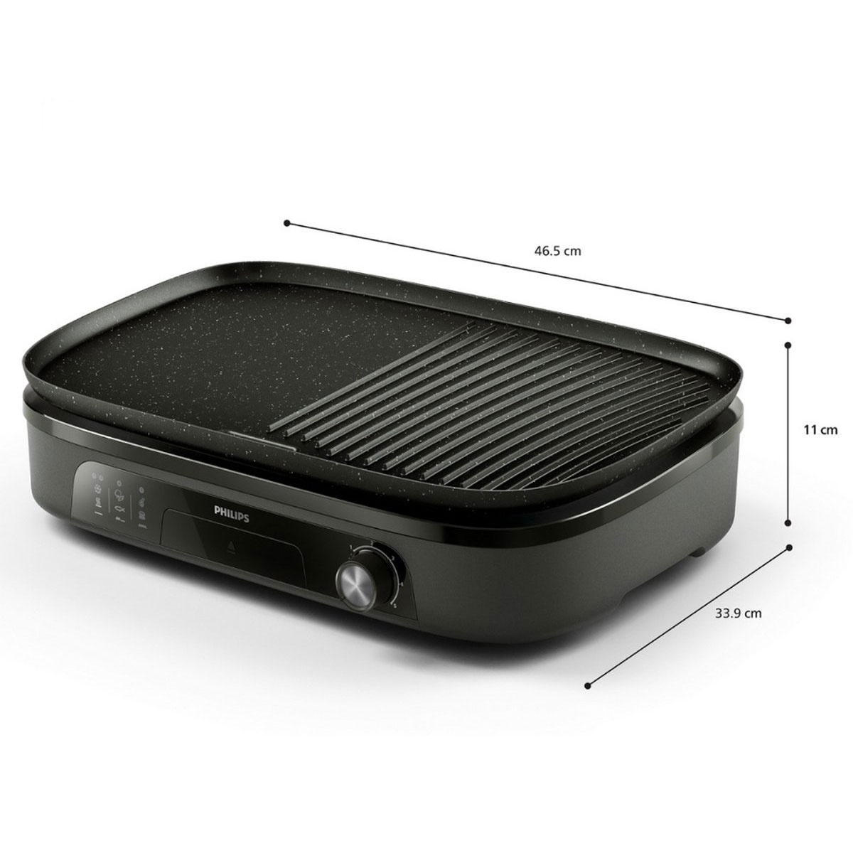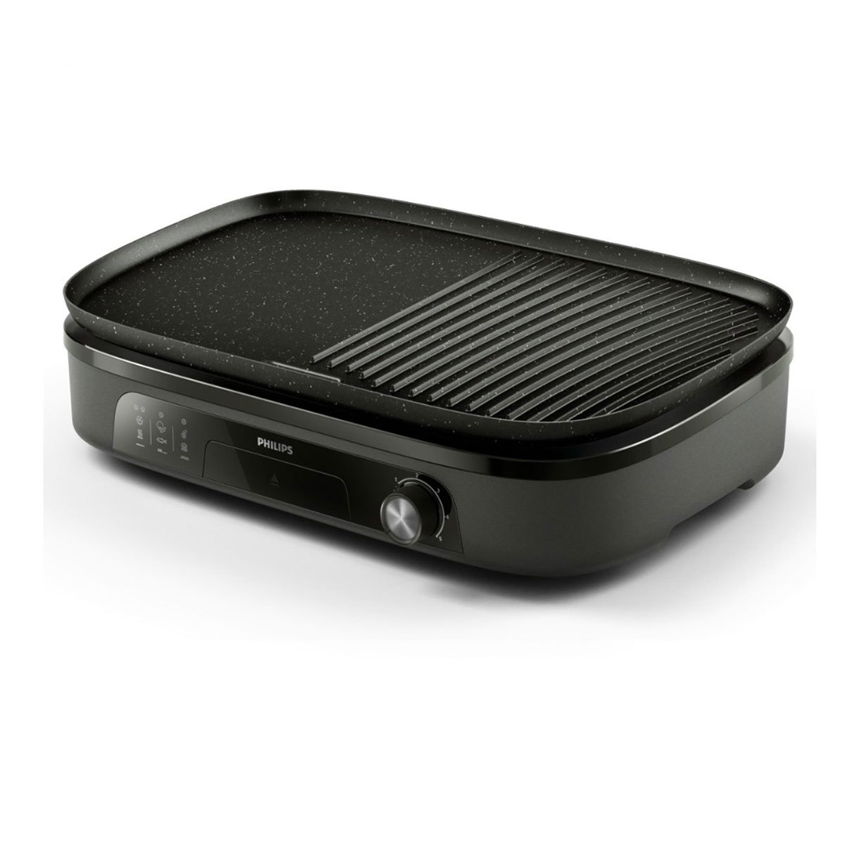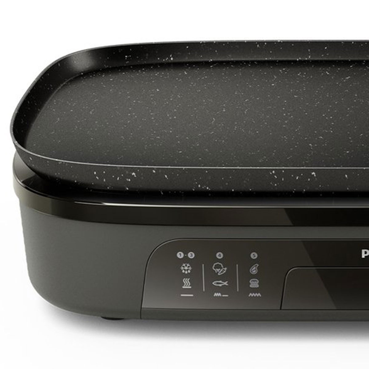 Het geheim van de HD6210/90 is de ingenieuze 2-in-1 combinatie bak- en grillplaat. Voel u een chef-kok terwijl u op de geribbelde zijde die perfecte biefstuk, sappige burger of delicate visfilet bereidt, compleet met authentieke grillstrepen. Draai de plaat om en u onthult een volledig vlakke bakplaat. Dit is uw canvas voor een perfect weekendontbijt met eieren, spek en pannenkoekjes, of voor het zacht bakken van champignons en paprika’s. Met een royaal grilloppervlak van 1250 cm² is er meer dan genoeg ruimte voor ieders favoriete ingrediënten.